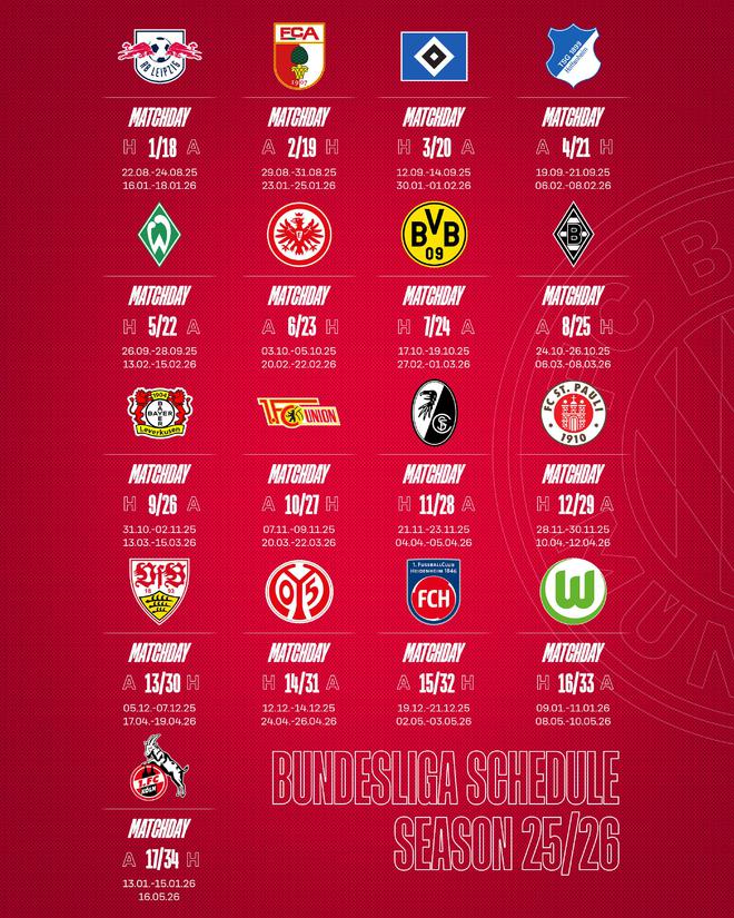 拜仁新赛季德甲赛程:首轮主场战莱比锡,第7轮迎国家德比
