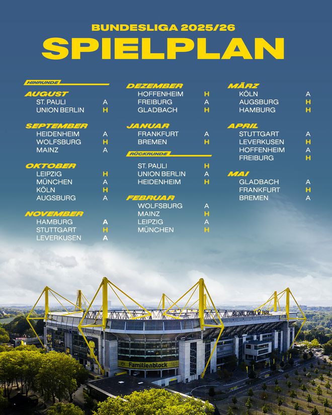 多特25/26德甲赛程:10月、2月先后客场、主场对阵拜仁