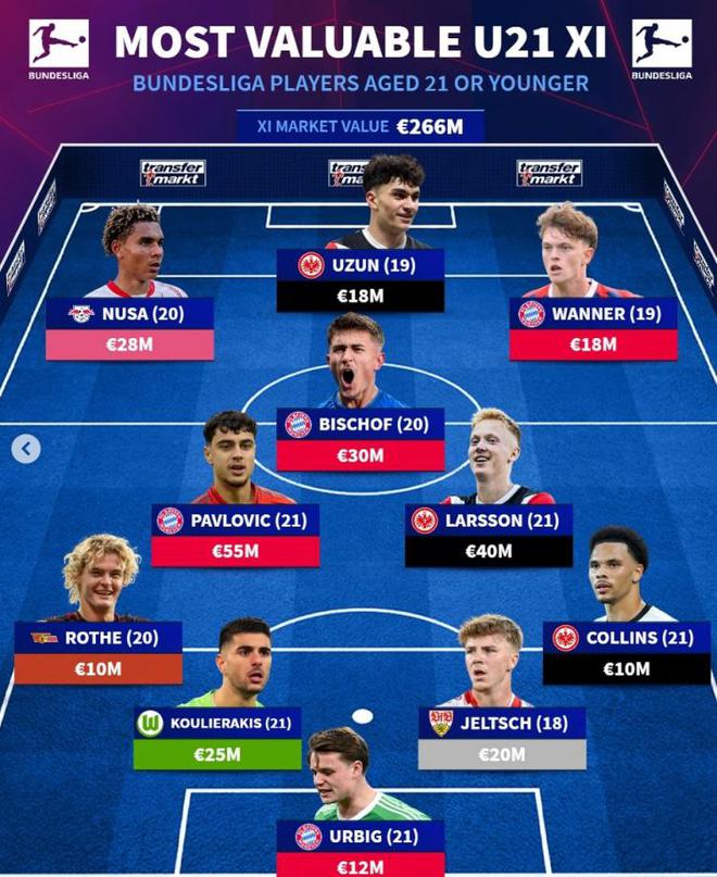 德转列德甲U21最贵阵:帕夫洛维奇领衔拜仁4将,法鹰3人在列